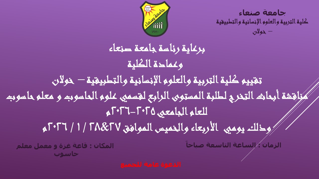 برعاية رئاسة جامعة صنعاء وعمادة كلية التربية والعلوم الإنسانية والتطبيقية بخولان – جامعة صنعاء، تواصلت، لليوم الخامس على التوالي، جلسات المناقشة العلنية لأبحاث ومشاريع تخرج طلبة البكالوريوس بقسم علوم الحاسوب.