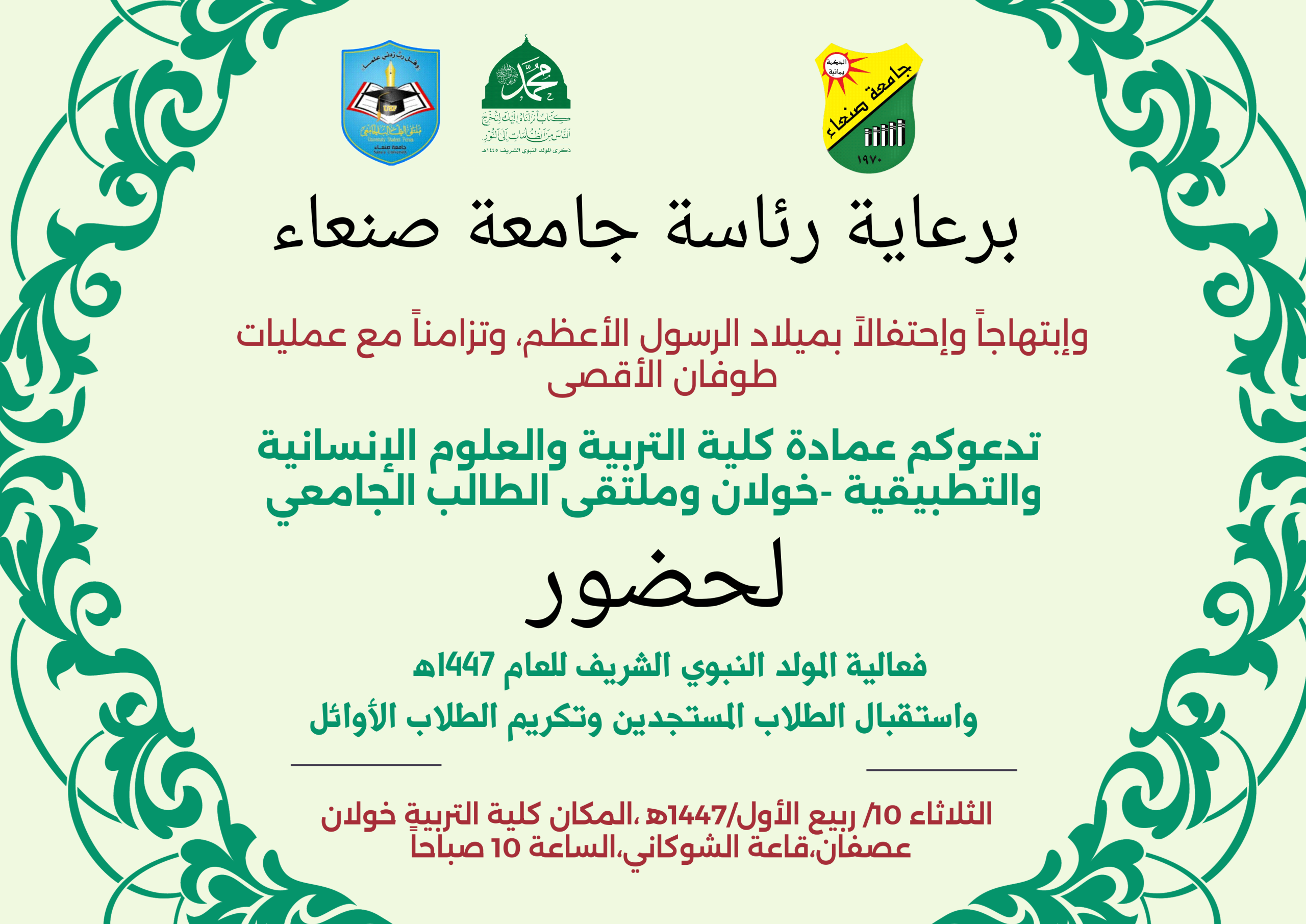 برعاية رئاسة جامعة صنعاء وابتهاجاً واحتفاءً بميلاد الرسول الأعظم ، تدعوكم عمادة كلية التربية والعلوم الإنسانية والتطبيقية -خولان وملتقى الطالب الجامعي لحضور فعالية المولد النبوي الشريف للعام 1447هـ، واستقبال الطلاب الجُدد وتكريم الطلاب الأوائل. الثلاثاء بتاريخ 10/ ربيع الأول/ 1447هـ، …