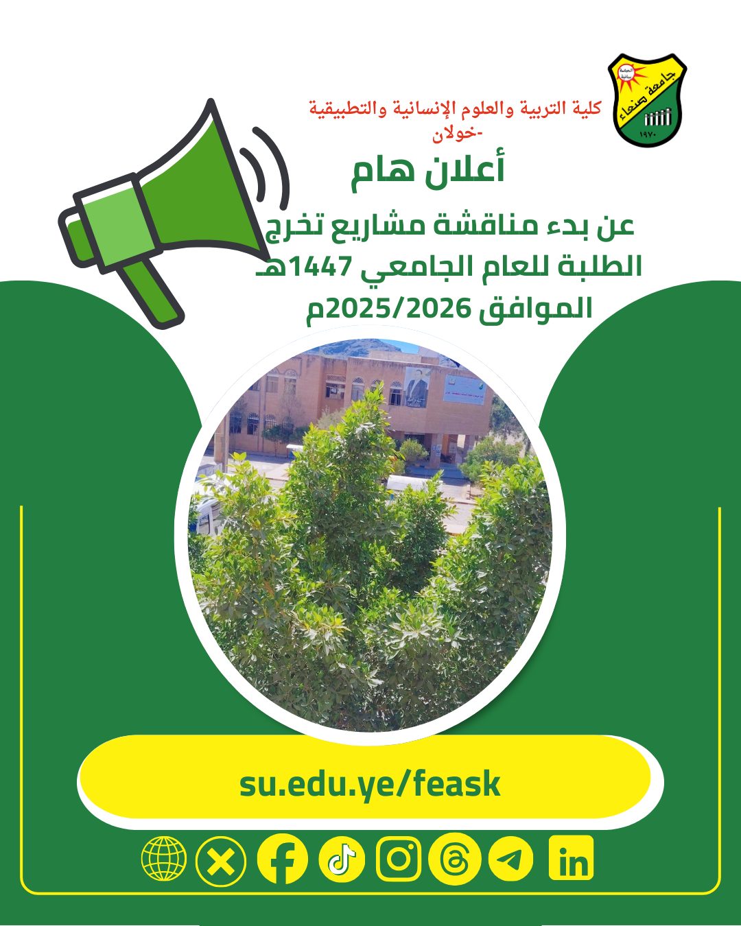 تُعلن كلية التربية والعلوم الإنسانية والتطبيقية -خولان عن بدء مناقشة مشاريع تخرج الطلبة للعام الجامعي 1447هـ الموافق 2025/2026م، وذلك ابتداءً من يوم السبت 28/7/1447هـ ولمدة أسبوعين. وعليه، نهيب بالطلبة المعنيين الالتزام بالمواعيد المحددة وفق الجداول المعلنة، والحضور في الأوقات والأماكن …