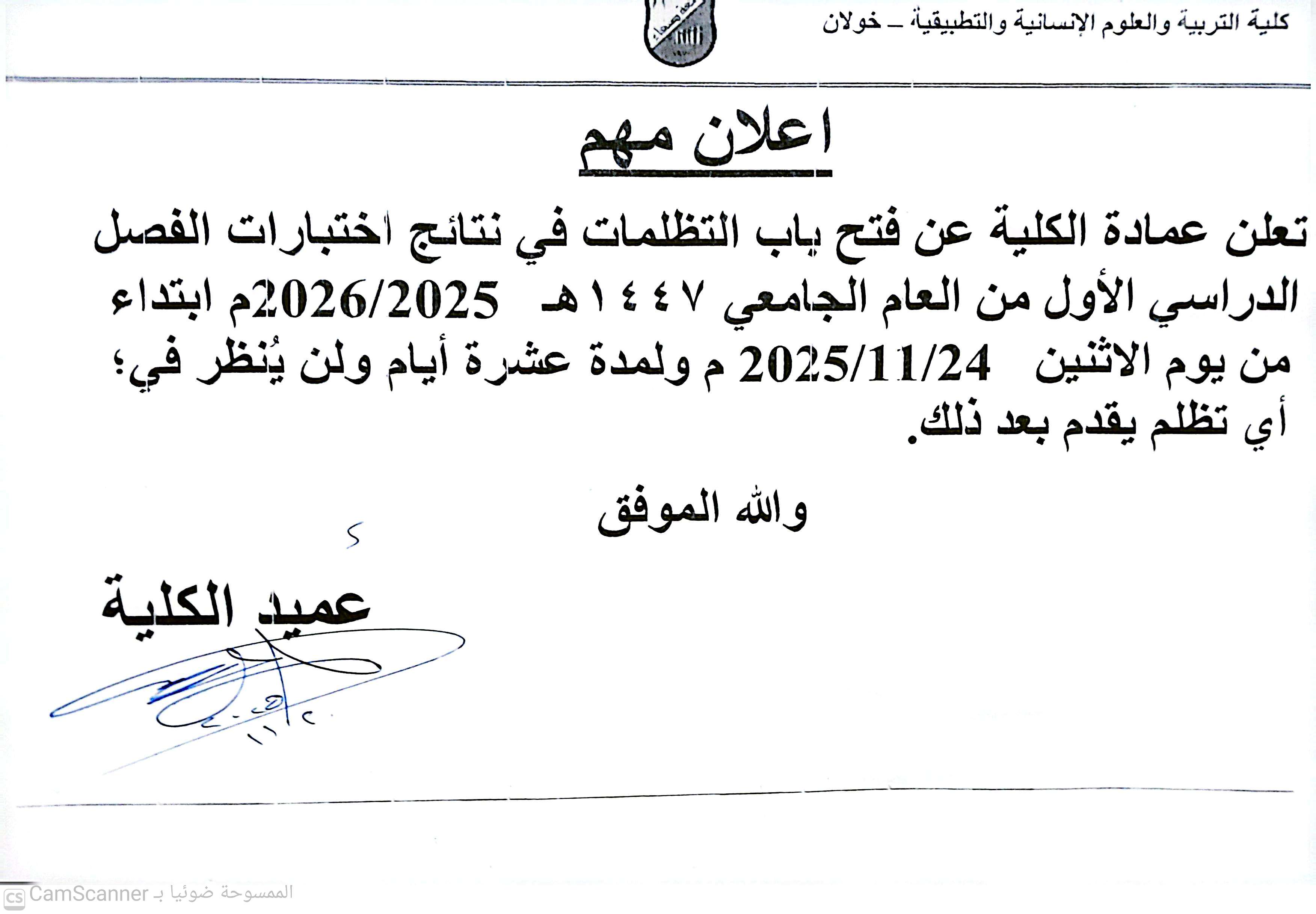 أعلنت كلية التربية والعلوم الإنسانية والتطبيقية -خولان بجامعة صنعاء عن فتح باب التظلمات لنتائج امتحانات الفصل الدراسي الأول للعام الجامعي 2025/2026، وذلك لمدة عشرة أيام من تاريخ الإعلان ، ولن ينظر في أي تظلم يقدم بعد ذلك .