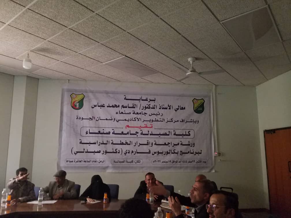 أقامت كلية الصيدلة – جامعة صنعاء ورشة مراجعة وإقرار الخطة الدراسية لبرنامج بكالوريوس فارم دي (دكتور صيدلي ) يوم الاثنين 22- صفر 1444هـ الموافق 19 سبتمبر 2022م .