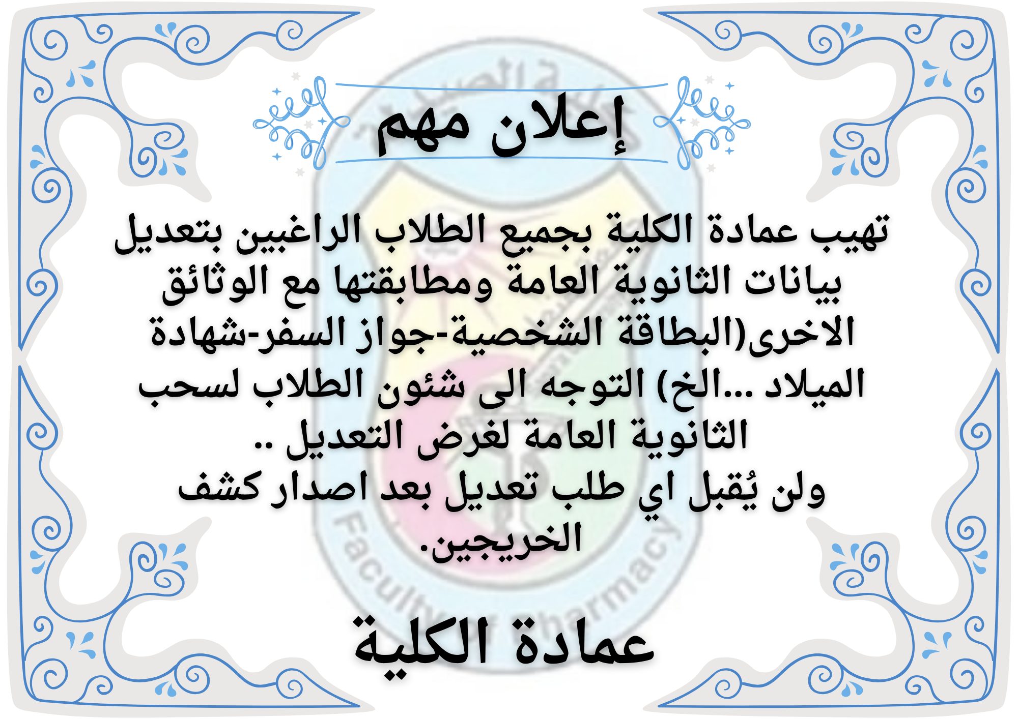 عمادة الكلية تدعو الطلاب إلى استكمال تعديل بيانات الثانوية العامة.