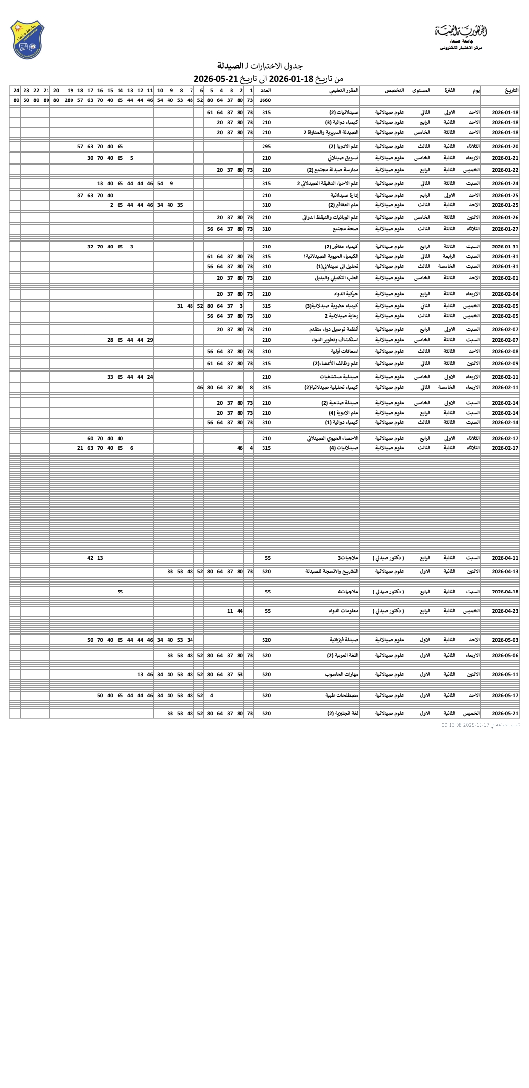جدول امتحانات كلية الصيدلة الفصل الثاني للعام الجامعي 2026/2025م