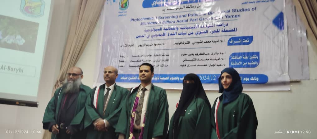 نال الطالب الحارث محمد احمد السماوي درجة الماجستير بتقدير ممتاز في قسم العقاقير بكلية الصيدلة بجامعة صنعاء عن رسالته الموسومة بـ (دراسة المكونات الكيميائية والفعالية البيولوجية المحتملة للجزء العلوي من نبات الندغ الليموني في اليمن ) يوم الاحد 29 جمادى …