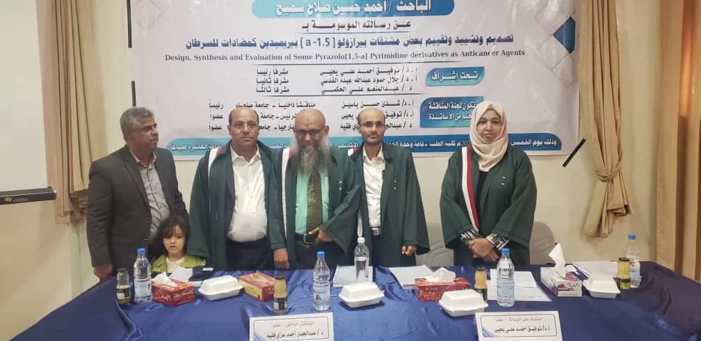 مناقشة رسالة الماجستير – تخصص كيمياء دوائية تحليليه عضوية صيدلانيه – المقدمة من الطالب احمد حسين صلاح سميح بعنوان (تصميم وتشييد وتقييم بعض مشتقات بيرازولو(1, 5-a) بيريميدين كمضادات للسرطان. Design, Synthesis and Evaluation of Some Pyrazolo (1,5-a )Pyrimidine as Anticancer. …