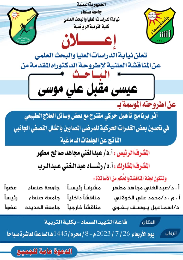 أثر برنامج تأهيل حركي مقترح مع بعض وسائل العلاج الطبيعي في تحسين بعض القدرات الحركية للمرضى المصابين بالشلل النصفي الجانبي الناتج عن الجلطات الدماغية Posted by mbeshr التصنيفات الأبحاث المنشورة Date يوليو 21, 2023 تنزيل الملخص Share: mbeshr المقال السابق تأثير المقررات العملية في تحسين بعض القدرات البدنية والفسيولوجية لدى طلبة كلية التربية الرياضية بجامعة صنعاء يوليو 21, 2023 المقال التالي كلية التربية الرياضية تعقد سمنار مفتوح لمناقشة خطط رسائل الماجستير في التربية الرياضية أغسطس 13, 2023 You may also like مناقشة علنية لرسالة الدكتوراه بعنوان “تأثير استخدام بعض وسائل العلاج الطبيعي في تحسين التوافق العصبي العضلي والاداء الحركي لدى الاطفال المصابين بالشلل الدماغي “ 12 نوفمبر, 2023 مناقشة علنية لرسالة الدكتوراه بعنوان “فاعلية تدريس مناهج التربية الرياضية المقترحة للصفوف الثلاثة الأولى من مرحلة التعليم الأساسي في ضوء احتياجاتهم البدنية والمهارية والمعرفية” 12 نوفمبر, 2023 كلية التربية الرياضية تعلن مناقشة علنية لرسالة ماجستير حول (أثر برنامج للتمرينات العلاجية بمصاحبة برنامج غذائي مقترح لتخفيف آلام الظهر لدى السيدات البدينات بنادي بلقيس بأمانة العاصمة.) 22 أغسطس, 2023