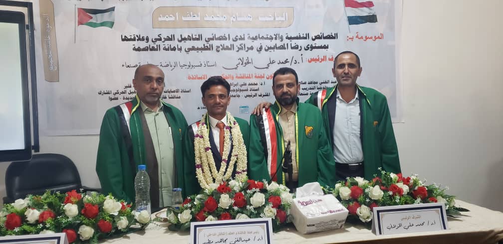 نال الباحث هشام محمد لطف احمد درجة الماجستير في التربية الرياضية، قسم التربية الرياضية، من كلية التربية الرياضية، بجامعة صنعاء، عن رسالته الموسومة بـ ” الخصائص النفسية والاجتماعية لدى اخصائي التأهيل الحركي وعلاقتها بمستوى رضا المصابين في مراكز العلاج الطبيعي بأمانة العاصمة”.