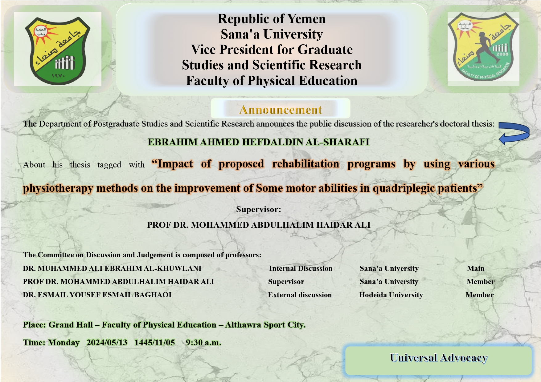 The Faculty of Sports Education announces the discussion of the doctoral thesis marked “Impact of proposed rehabilitation programs by using various physiotherapy methods on the improvement of Some motor abilities in quadriplegic patients“ on Monday, 1445/11/05H 2024/05/13, in the Grand Hall of the Faculty of Sports Education in Al-Thawra Sport City 9:30 a.m .