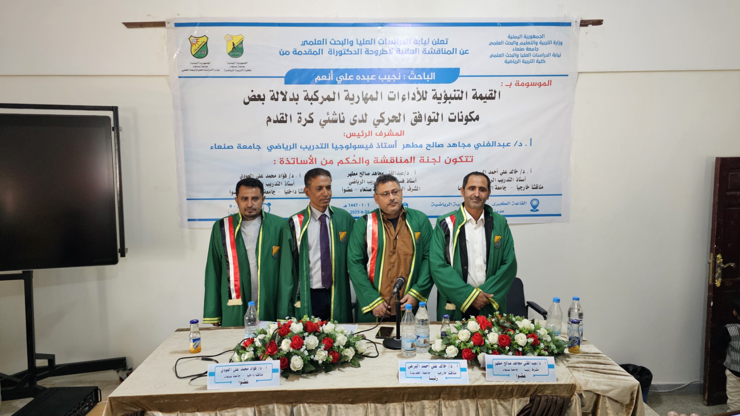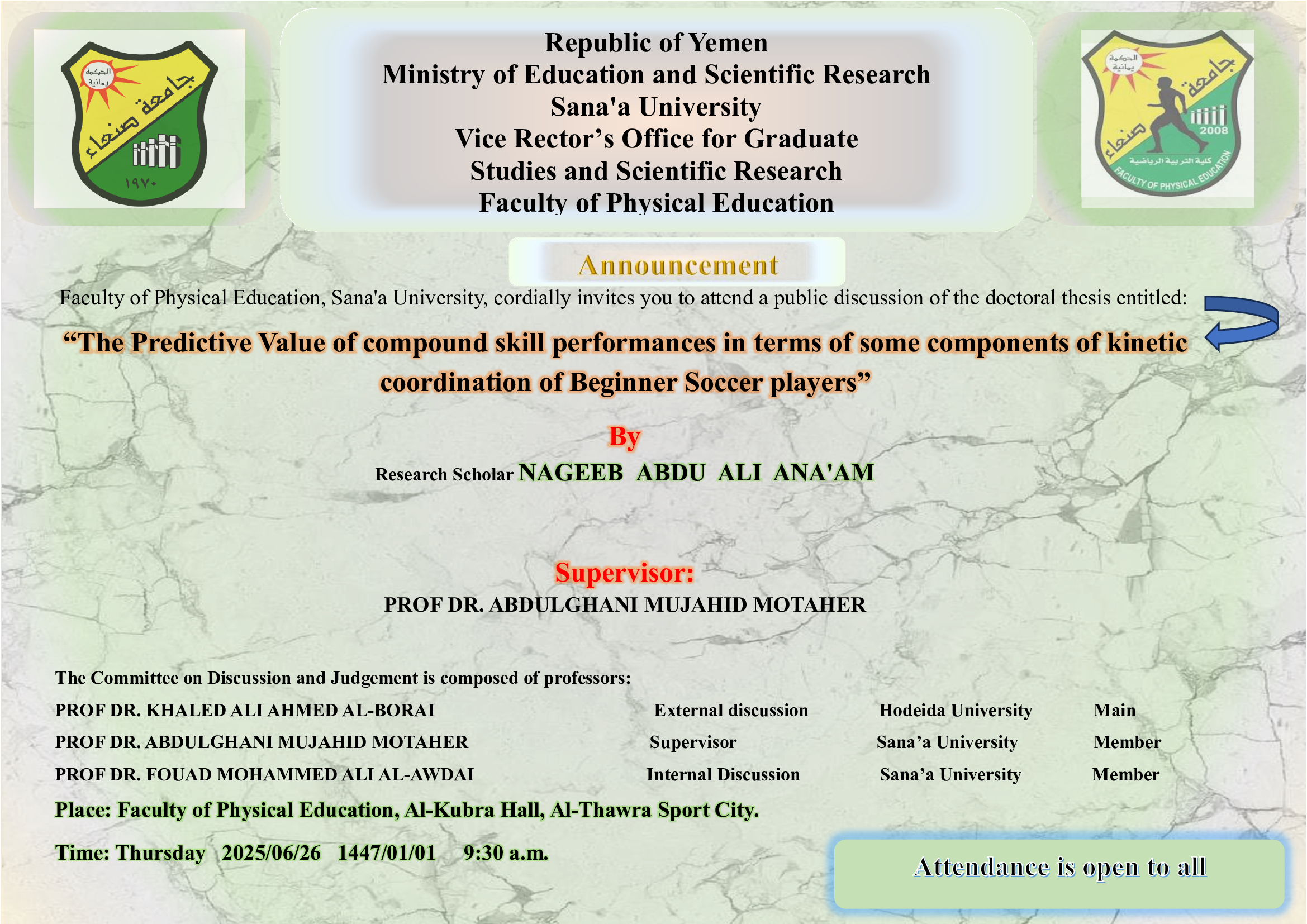 Faculty of Physical Education , Sana’a University ,Cordially invites you to attend a public discussion of the doctoral thesis entitled : “ The Predictive Value of compound skill performances in terms of some components of kinetic coordination of Beginner Soccer …