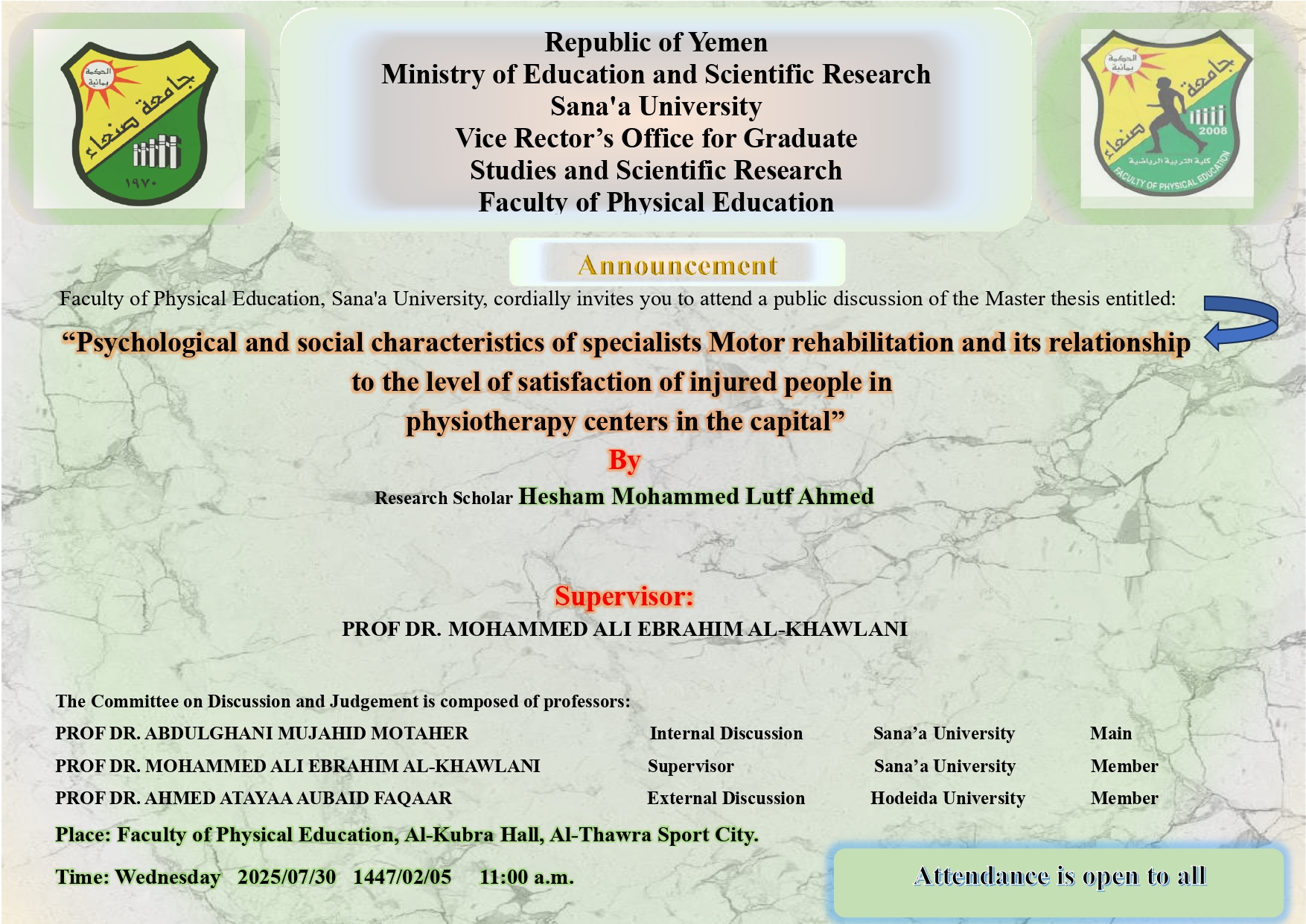 Faculty of Physical Education, Sana’a University, cordially invites you to attend a public discussion of the Master thesis entitled: “Psychological and social characteristics of specialists Motor rehabilitation and its relationship to the level of satisfaction of injured people in physiotherapy …