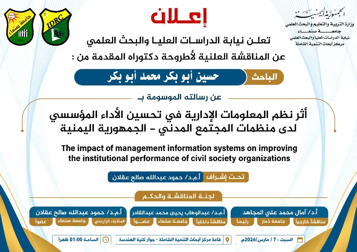The Inclusive Development Research Center (IDRC) at Sana’a University is pleased to announce the public defense of the Ph.D. dissertation by Researcher Hussein Abubaker Mohammed Abubaker, titled: The Impact of Management Information Systems on Improving the Institutional Performance of Civil Society Organizations in the Republic of Yemen.