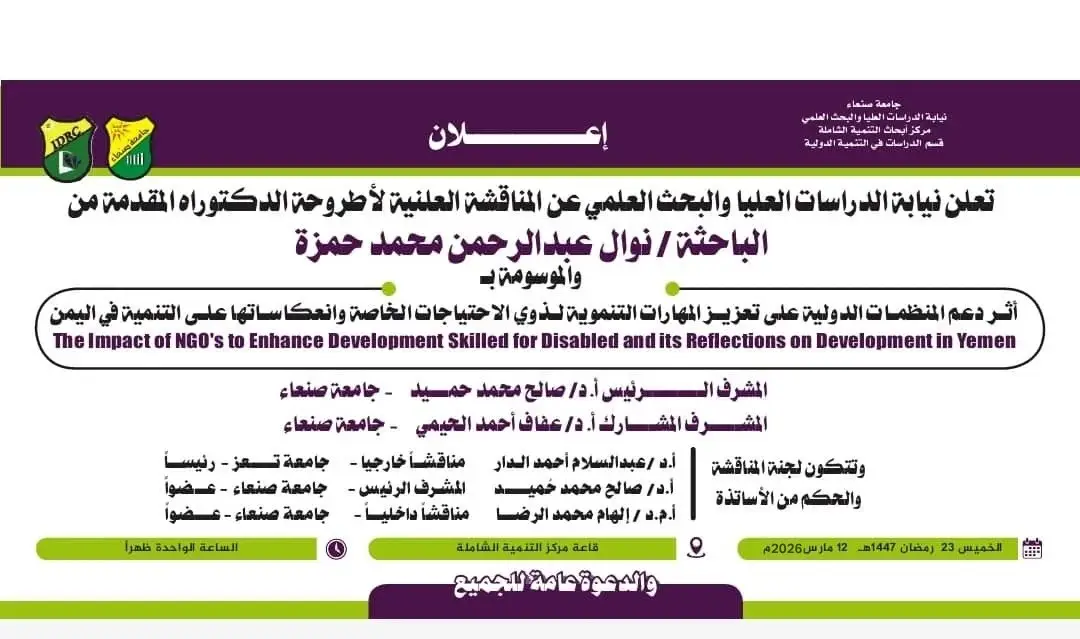 The Inclusive Development Research Center (IDRC) at Sana’a University is pleased to announce the public defense of the Ph.D. dissertation by Researcher Nawal Abdul Rahman Mohmmed Hamza titled: The Impact of NGOs to Enhance Development Skilled for Disabled and Its Reflections on Development in Yemen “Sana’a city”.