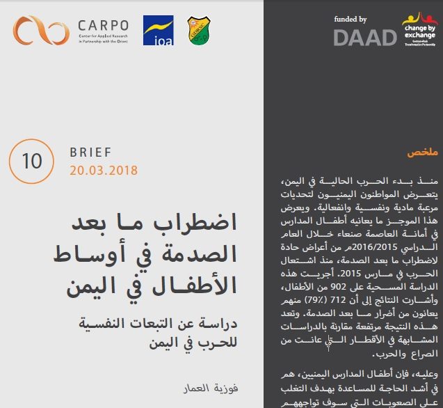 الكاتبة: د. فوزية العمــار. ملخص: منـــذ بـــدء الحـــرب الحاليـــة في اليمن، يتعـــرض المواطنون اليمنيـــون لتحديات مرعبة مادية ونفســـية وانفعالية. ويعرض هذا الموجـــز ما يعانيه أطفـــال المدارس في أمانـــة العاصمة صنعاء خـــلال العام الـــدراسي 2016/2015م من أعراض حادة لإضطراب ما بعد …
