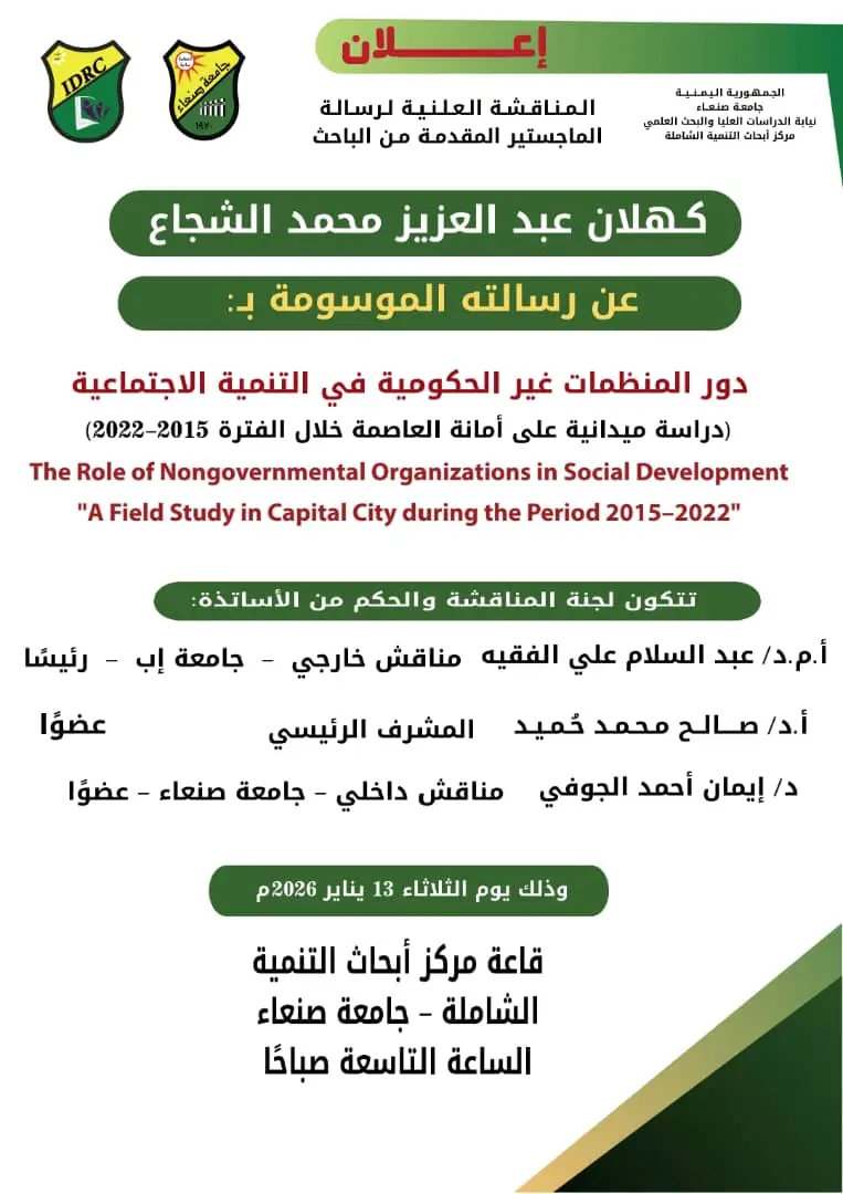 يعلن مركز أبحاث التنمية الشاملة عن المناقشة العلنية لرسالة الماجستير المقدمة من الباحث/ كهلان عبدالعزيز محمد الشجاع، والموسومة بـ “دور المنظمات غير الحكومية في التنمية الاجتماعية”دراسة ميدانية على أمانة العاصمة خلال الفترة 2015-2022” – التاريخ: الثلاثاء 13/ 1/ 2026م. – …