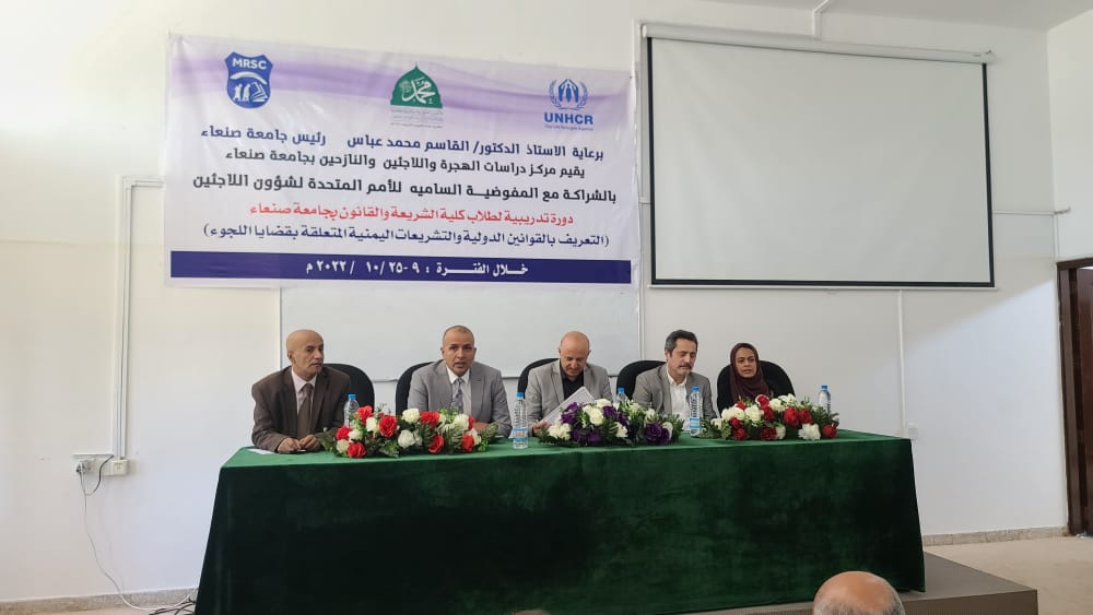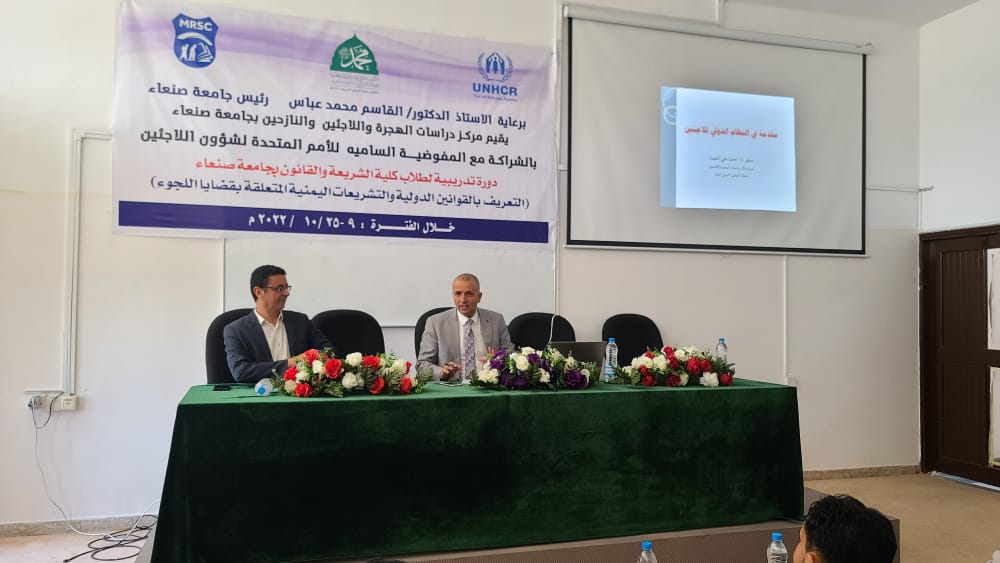 برعاية كريمة من رئيس جامعة صنعاء أ.د/ القاسم محمد عباس قام مركز دراسات الهجرة واللاجئين والنازحين-جامعة صنعاء وبالشراكة مع المفوضية السامية للأمم المتحدة لشؤون اللاجئين بافتتاح الدورة التدريبية السنوية لـ “لطلاب كلية الشريعة والقانون بجامعة صنعاء (التعريف بالقوانين الدولية والتشريعات الوطنية المتعلقة بقضايا اللجوء) للفترة من ٩-٢٥/١٠/٢٠٢٢م، حيث افتتح الفعالية أ.د/ أحمد علي العماد- مدير المركز بكلمات الترحيب للحاضرين جميعاً وعلى رأسهم رئيس جامعة صنعاء أ.د/ القاسم محمد عباس- الراعي الرسمي لهذه الفعالية الهامة والنوعية والسيد/ إيراج مومبارديف- نائب ممثل مكتب المفوضية السامية للأمم المتحدة لشؤون اللاجئين ومعه السيدة/ نوف الهاشمي- ضابط مساعد بقسم الحماية بالمفوضية ومن كلية الشريعة والقانون د/ طارق المجاهد- عميد كلية الشريعة والقانون سابقاً ورئيس قسم القانون الدولي الخاص بالكلية.