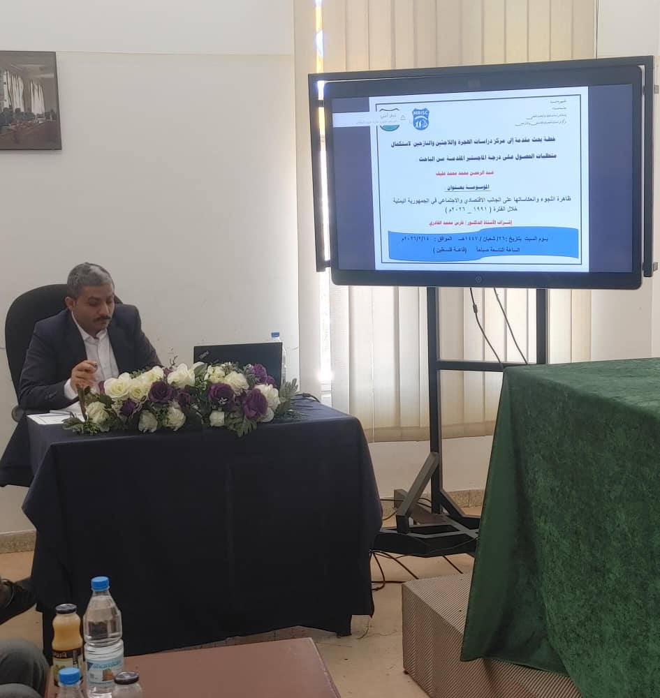 مناقشة (اللجوء واثره على الجانب الاقتصادي والاجتماعي دراسة تطبيقية على الجمهورية اليمنية) خطة (ماجستير) في مركز دراسات الهجرة واللاجئين والنازحين تخصص هجرة ولجوء بجامعة صنعاء