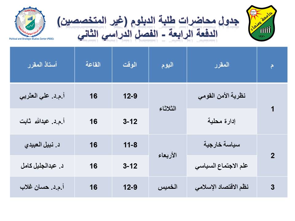 دشّن مركز الدراسات السياسية والاستراتيجية بجامعة صنعاء، اليوم، الفصل الدراسي الثاني للعام الجامعي 2026–2027م لطلاب الدفعة الرابعة من برنامج «دبلوم العلوم السياسية لغير المتخصصين»، ضمن الخطة الأكاديمية المعتمدة من مجلس المركز.