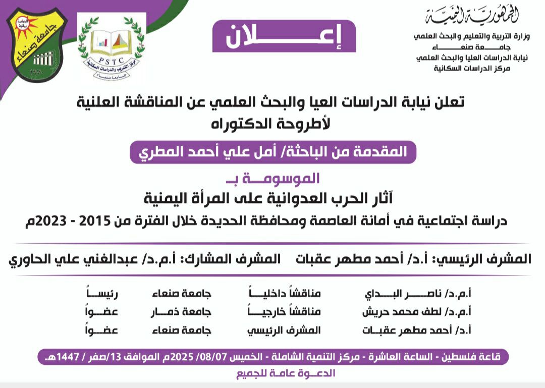 تعلن نيابة الدراسات العليا والبحث العلمي ومركز التدريب والدراسات السكانية عن المناقشة العلنية لأطروحة الدكتوراه، المقدمة من الباحثة/ أمل علي أحمد المطري، الموسومة بـ(آثار الحرب العدوانية على المرأة اليمنية؛ دراسة اجتماعية في أمانة العاصمة ومحافظة الحديدة خلال الفترة من 2015 -2023 م)، المشرف الرئيسي: أ.د. أحمد مطهر عقبات، المشرف المشارك: أ.م.د عبدالغني علي الحاوري.