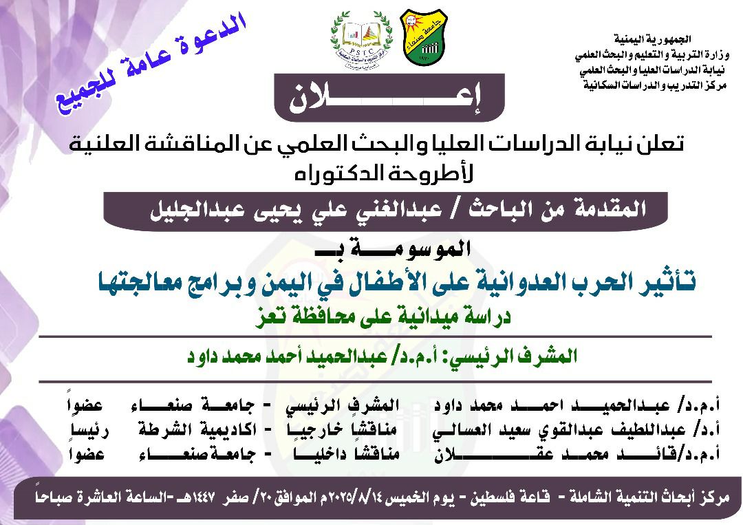 تعلن نيابة الدراسات العليا والبحث العلمي ومركز التدريب والدراسات السكانية عن المناقشة العلنية لأطروحة الدكتوراه، المقدمة من الباحث/ عبدالغني علي يحيى عبدالجليل، الموسومة بـ(تأثير الحرب العدوانية على الأطفال في اليمن وبرامج معالجتها دراسة ميدانية على محافظة تعز)، المشرف الرئيسي: أ.م.د/ عبدالحميد أحمد محمد داود.