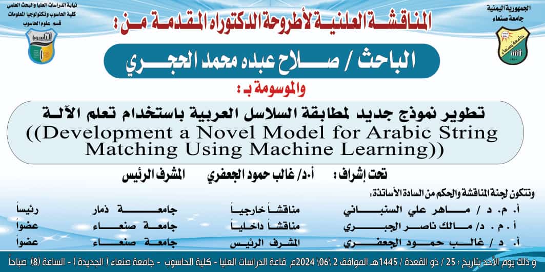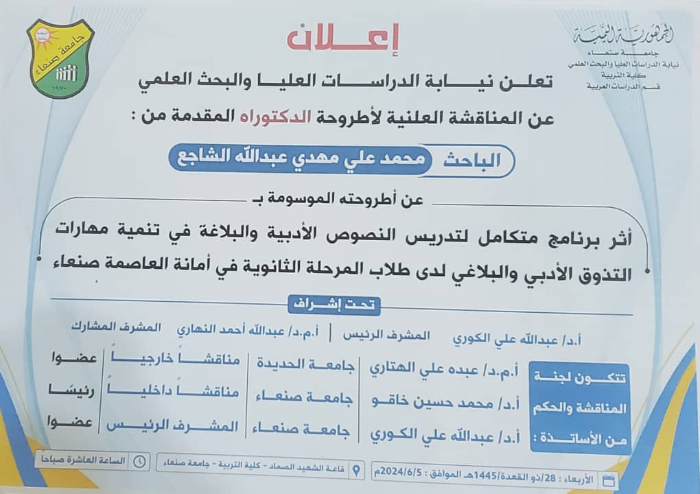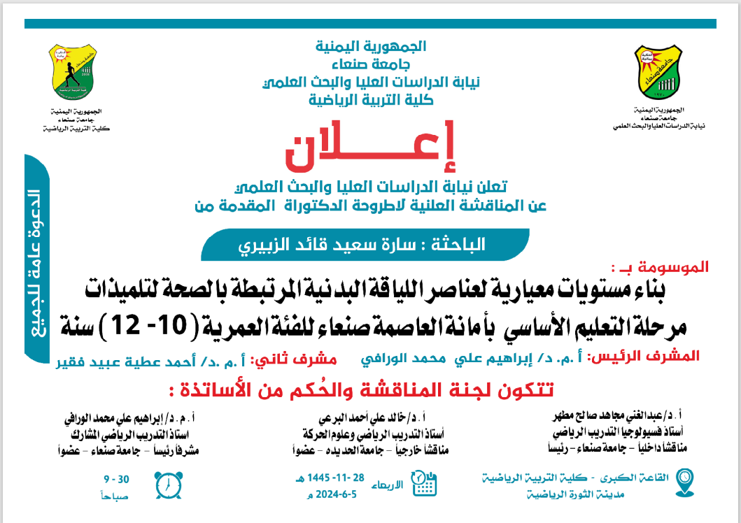 تعلن نيابة الدراسات العليا والبحث العلمي عن المناقشة العلنية لأطروحة …