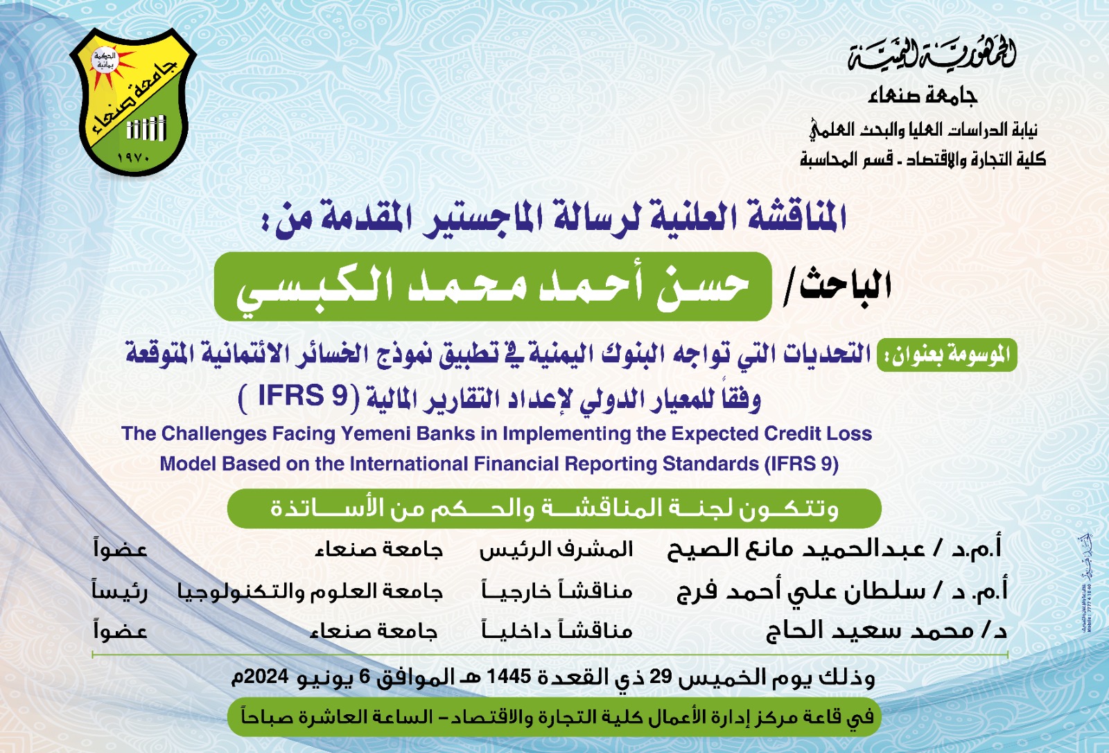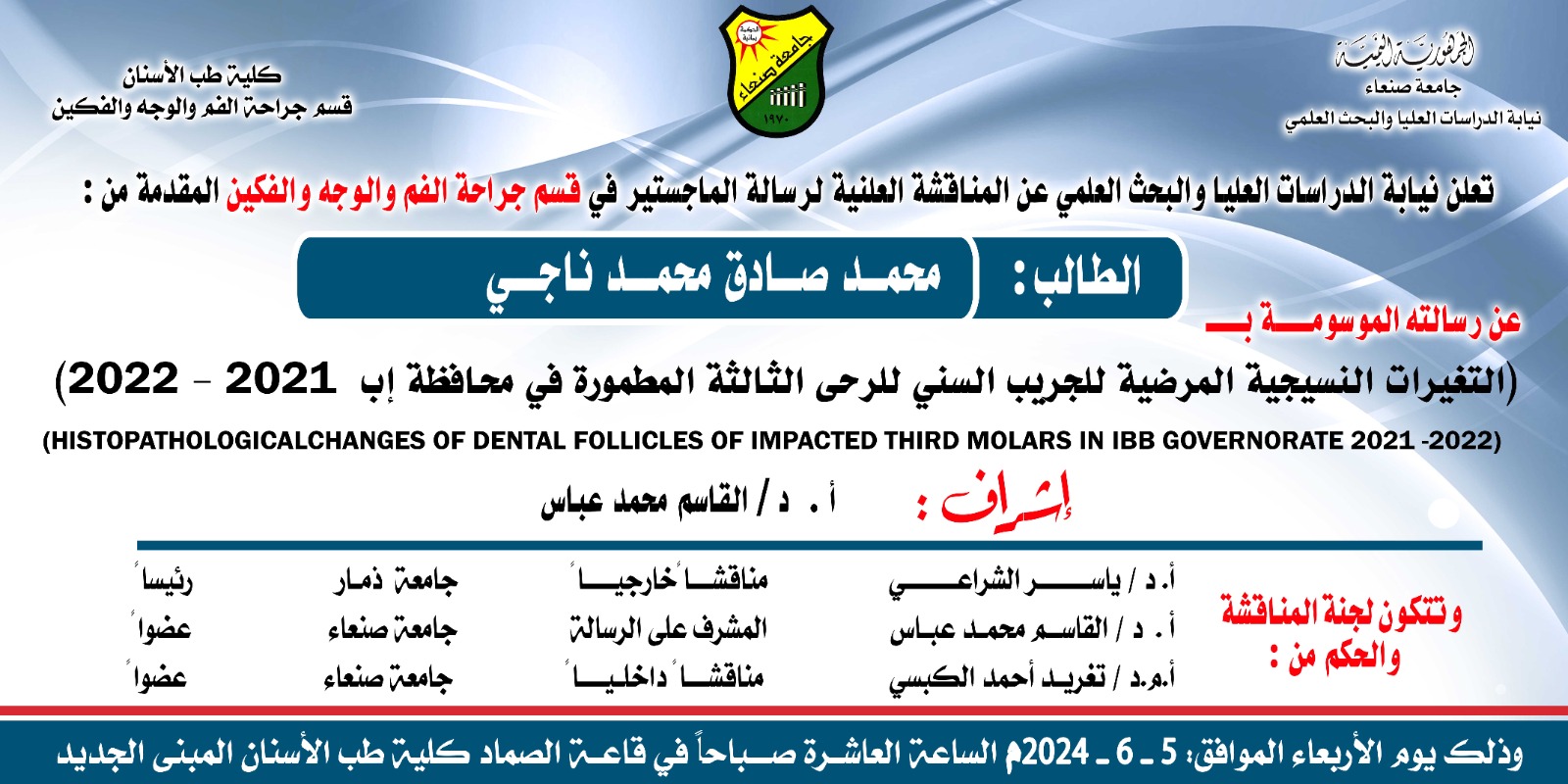 تعلن نيابة الدراسات العليا والبحث العلمي بجامعة صنعاء عن المناقشة …
