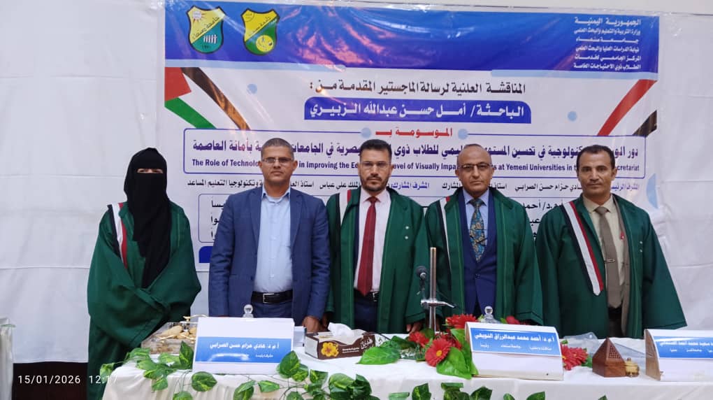 نالت الباحثة أمل حسن عبد الله الزبيري درجة الماجستير بنسبة (95%) وبتقدير ممتاز في قسم التربية الخاصة بالمركز الجامعي لخدمات الطلاب ذوي الاحتياجات الخاصة بجامعة صنعاء، وقد أوصت لجنة المناقشة بطباعة الرسالة وتداولها بين الجامعات، وذلك عن رسالتها الموسومة بـ: …