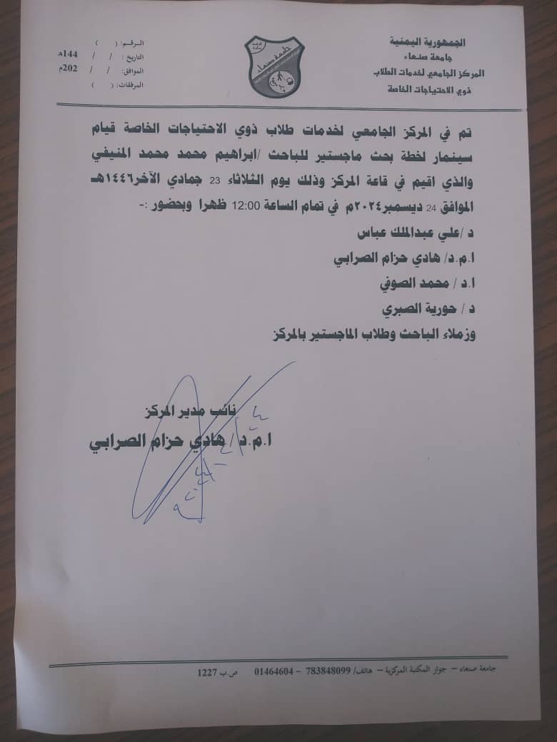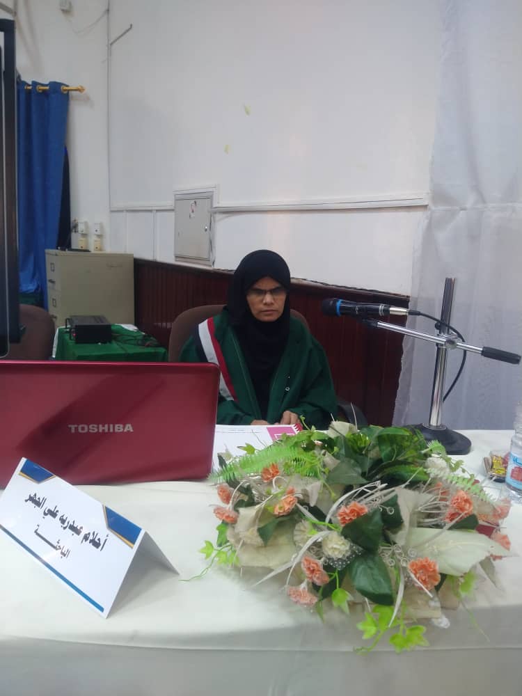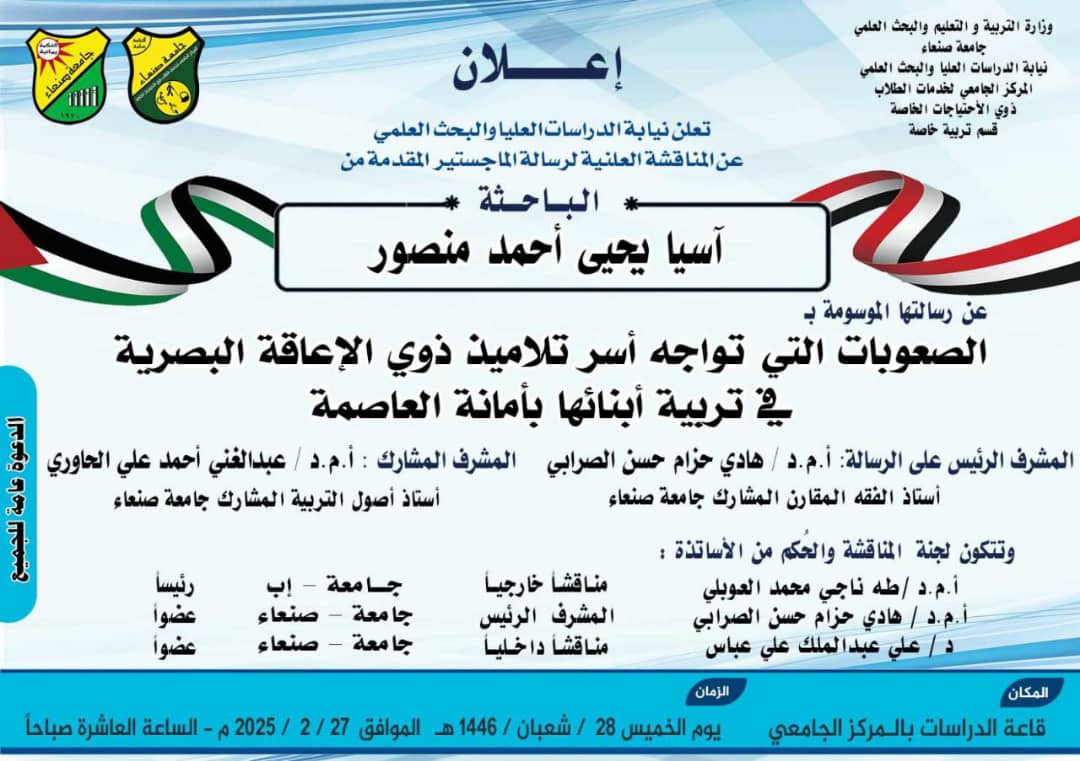 تعلن نيابة الدراسات العليا والبحث العلمي عن المناقشة العلنية لرسالة الماجستير المقدمة من الباحثة آسيا يحيى أحمد منصور عن رسالتها الموسومة بـ الصعوبات التي تواجه أسر تلاميذ ذوي الإعاقة البصرية في تربية أبنائها بأمانة العاصمة.