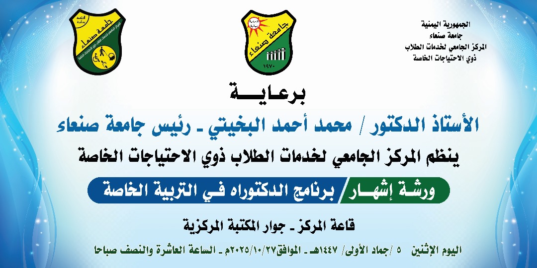 الأثنين، 5 جمادى الأولى 1447هـ الموافق 27 أكتوبر 2025م نظم المركز الجامعي لخدمات الطلاب ذوي الاحتياجات الخاصة بجامعة صنعاء، اليوم، ورشة خاصة لإشهار “برنامج الدكتوراه في التربية الخاصة”. يهدف البرنامج إلى تأهيل كوادر متخصصة ومتمكنة معرفياً ومهنياً لتلبية احتياجات …