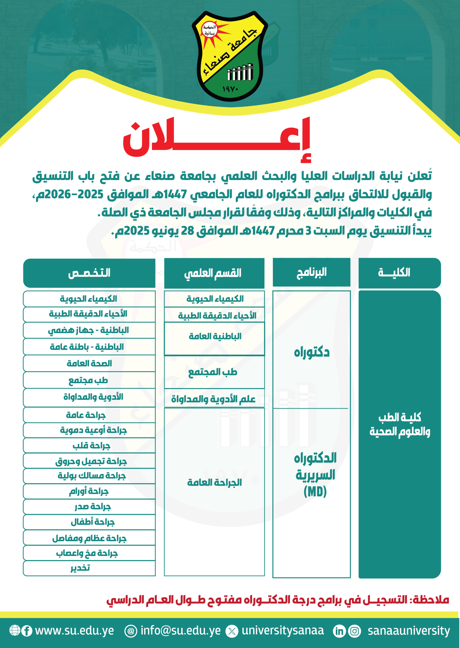 تُعلن نيابة الدراسات العليا والبحث العلمي بجامعة صنعاء عن فتح باب التنسيق والقبول للالتحاق ببرامج الدكتوراه للعام الجامعي 1447هـ الموافق 2025–2026م، في الكليات والمراكز التالية، وذلك وفقًا لقرار مجلس الجامعة ذي الصلة.