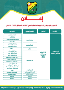 تُعلن نيابة الدراسات العليا والبحث العلمي بجامعة صنعاء عن فتح باب التنسيق والقبول للالتحاق ببرامج الدكتوراه للعام الجامعي 1447هـ الموافق 2025–2026م، في الكليات والمراكز التالية، وذلك وفقًا لقرار مجلس الجامعة ذي الصلة.