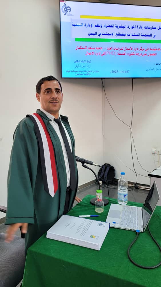 نال الباحث عبد الكريم علي ناجي مصلح العماري، درجة الدكتوراه في فلسفة إدارة الأعمال، من مركز إدارة الأعمال للدراسات العليا بجامعة صنعاء عن أطروحته بعنوان:” أثر تكامل ممارسات إدارة الموارد البشرية الخضراء ونظام الإدارة البيئية في التنمية المستدامة في مصانع …