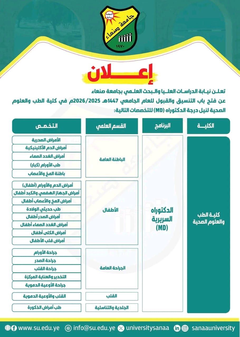 تعـلــن نيــابة الدراســات العلـــيا والــبحث العلــمي بجامعة صنعاء عن فتح باب التنسيق والقبول للعام الجامعي 1447هـ 2025/2026م في كلية الطب والعلوم الصحية لنيل درجة الدكتوراه (MD) للتخصصات التالية: الفترة (ابتداء من يوم السبت الموافق 7/3/2026م وينتهي في يوم السبت الموافق …