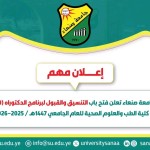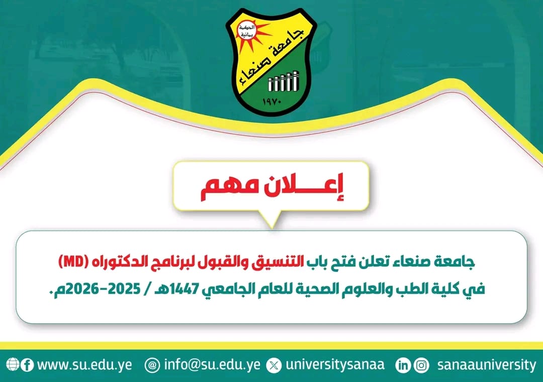 تعـلــن نيــابة الدراســات العلـــيا والــبحث العلــمي بجامعة صنعاء عن فتح باب التنسيق والقبول للعام الجامعي 1447هـ 2025/2026م في كلية الطب والعلوم الصحية لنيل درجة الدكتوراه (MD) للتخصصات التالية: الفترة (ابتداء من يوم السبت الموافق 7/3/2026م وينتهي في يوم السبت الموافق …