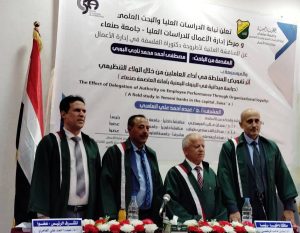 Mr. Mustafa Ahmed Mohammed Naji Al-Bawri was awarded a PhD degree in Business Administration for his dissertation titled: The Effect of Delegation of Authority on Employee Performance through Organizational Loyalty: A Field Study in Yemeni Banks in the Capital Secretariat, Sana’a, which was submitted to the Graduate Center for Business Administration Studies at Sana’a University. The dissertation defense was held on Tuesday, August 5, 2025.