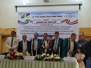Mr. Akram Mohammed Ali Al-Khaishni was awarded a Master’s degree in Translation with an average of (Excellent) and a grade of (95%) for his thesis titled: Problems Facing Senior Translation Students in Translating Phrasal Verbs in Business Texts from English into Arabic, which was submitted to the Community Center for Translation and Language Teaching – Sana’a University. The MA defense was held on Thursday, August 28, 2025.