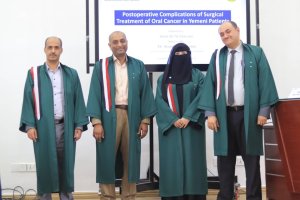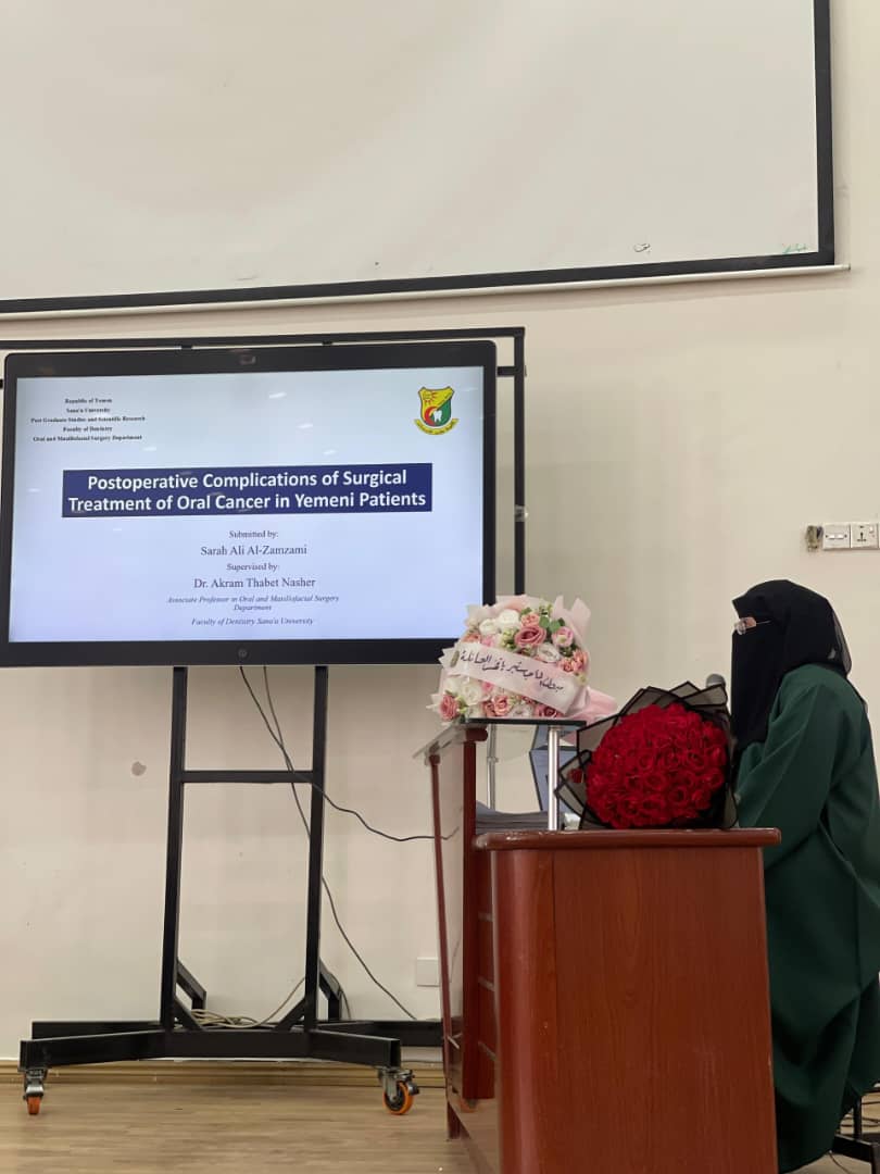 Ms. Sarah Ali Ali Muthanna Al-Zamzami was awarded a Master’s degree in Oral and Maxillofacial Surgery with distinction for her thesis titled: Post-operative Complications of Surgical Treatment of Oral Cancer in Yemeni Patients, which was submitted to the Department of Oral and Maxillofacial Surgery at the Faculty of Dentistry – Sana’a University. The MA defense was held on Monday, August 4, 2025.