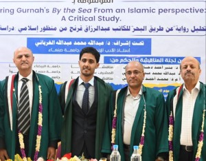 Mr. Ahmed Saleh Mohammed Ahmed Al-Bakeri was awarded a Master’s Degree in English Literature with an average of (Excellent) and a grade of (91%) for his thesis titled: Exploring Gurnah’s By the Sea from an Islamic Perspective: A Critical Study, which was submitted to the Department of English Language and Literature, Faculty of Arts and Humanities – Sana’a University. The MA defense was held on Saturday, October 4, 2025.