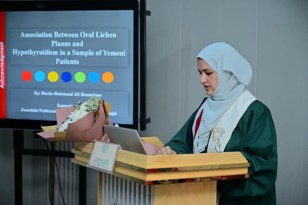 Ms. Mounia Mahmoud Ali Shamsher was awarded a Master degree in with an overall grade of (Excellent) and an average of (95%), for her thesis, titled “The Association of Oral Lichen Planus with Hypothyroidism in a Sample of Yemeni Patients,” …