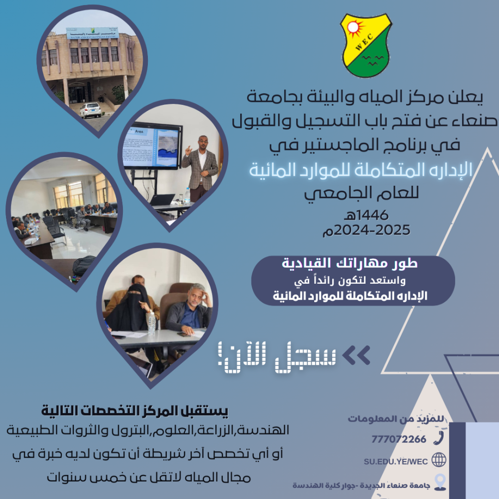 اعلان فتح باب التسجيل والقبول في برامج الماجستير في إدارة الموارد المائية المتكاملة للعام الجامعي 2024-2025م/1446هـ Posted by wafa التصنيفات الاخبار Date سبتمبر 21, 2024 يعلن مركز المياه والبيئة بجامعة صنعاء عن فتح باب التسجيل والقبول في برنامج الماجستير في ” إدارة الموارد المائية المتكاملة ” للعام الجامعي 2024-2025م/1446هـ. Share: wafa المقال السابق ضمن فعاليات تعزيز البحث العلمي مركز المياه والبيئة يعقد سيمنار بعنوان: تجربتي في البحث العلمي. سبتمبر 21, 2024 المقال التالي توقيع مذكرة تفاهم بين مركز المياه والبيئة بجامعة صنعاء ووزارة الكهرباء والطاقة والمياه أكتوبر 15, 2024 You may also like لجان الجودة بجامعة صنعاء تُجري تقييماً ميدانياً لبرامج الدراسات العليا بمركز المياه والبيئة 9 فبراير, 2026 مركز المياه والبيئة ينظم نشاطًا أكاديميًا حول قضية سد النهضة لطلاب الماجستير 7 فبراير, 2026 مركز المياه والبيئة بجامعة صنعاء يبحث التعاون مع الاتحاد الدولي لجمعيات الصليب الأحمر والهلال الأحمر 3 فبراير, 2026
