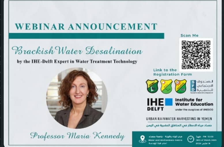 يقيم مركز المياه والبيئة بجامعة صنعاء ندوة بعنوان: تحلية المياه المالحة. تقدمها الخبيرة في تقنيات معالجة المياه في المعهد الدولي للدراسات الهيدروليكية في هولندا (IHE-Delft)، البروفيسور ماريا كندي، وذلك ضمن مبادرات المركز لتعزيز مصادر المياه في المناطق الحضرية. اليوم: الثلاثاء. …